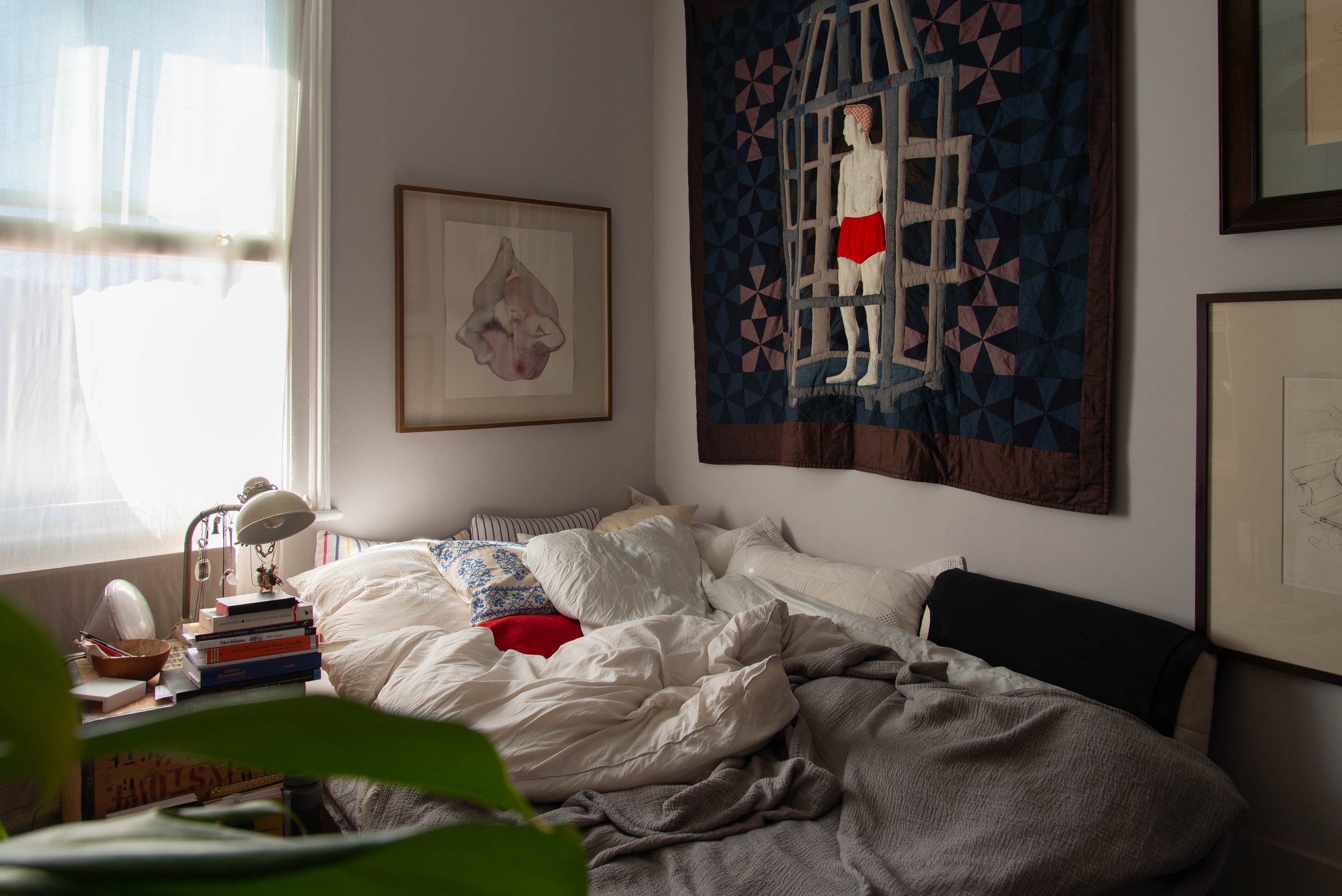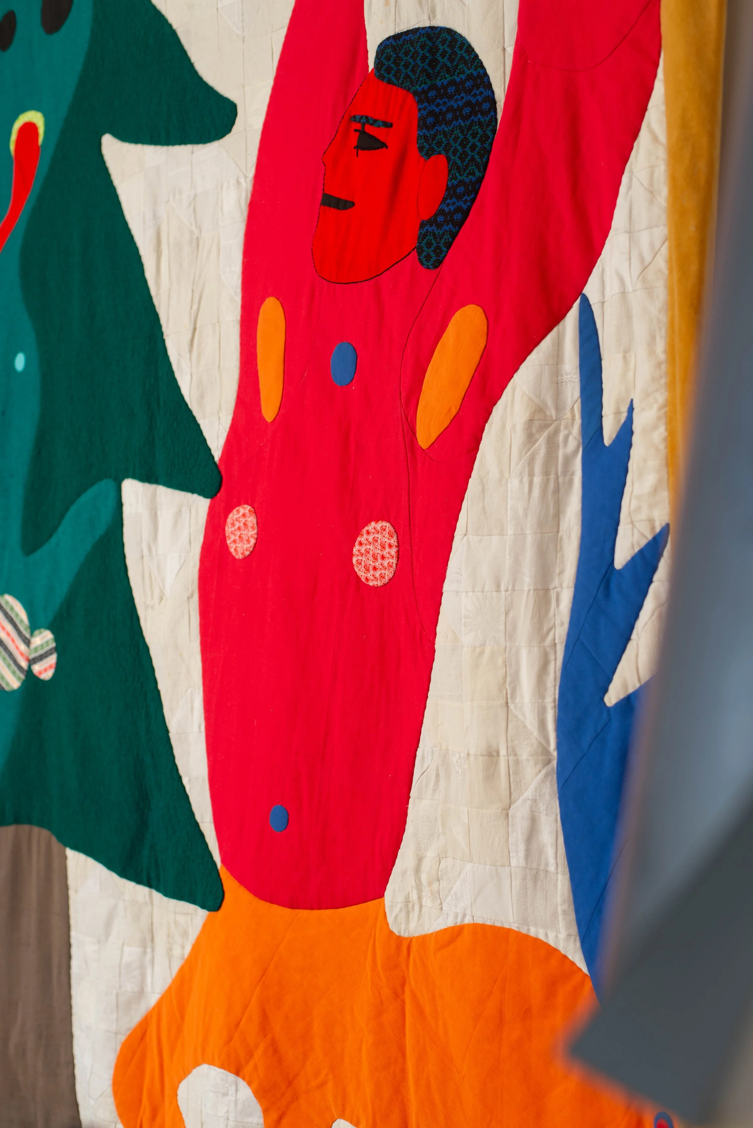Peter’s meticulously crafted handmade quilts often serve as an extension of the themes found in his watercolours and pencil drawings. Each quilt is a labour of love, intricately pieced together with inherited textiles and materials. Through the medium of quilting, Peter continues his exploration of subconscious realms and conceptual themes, weaving together narratives of identity, spirituality, and sensuality.