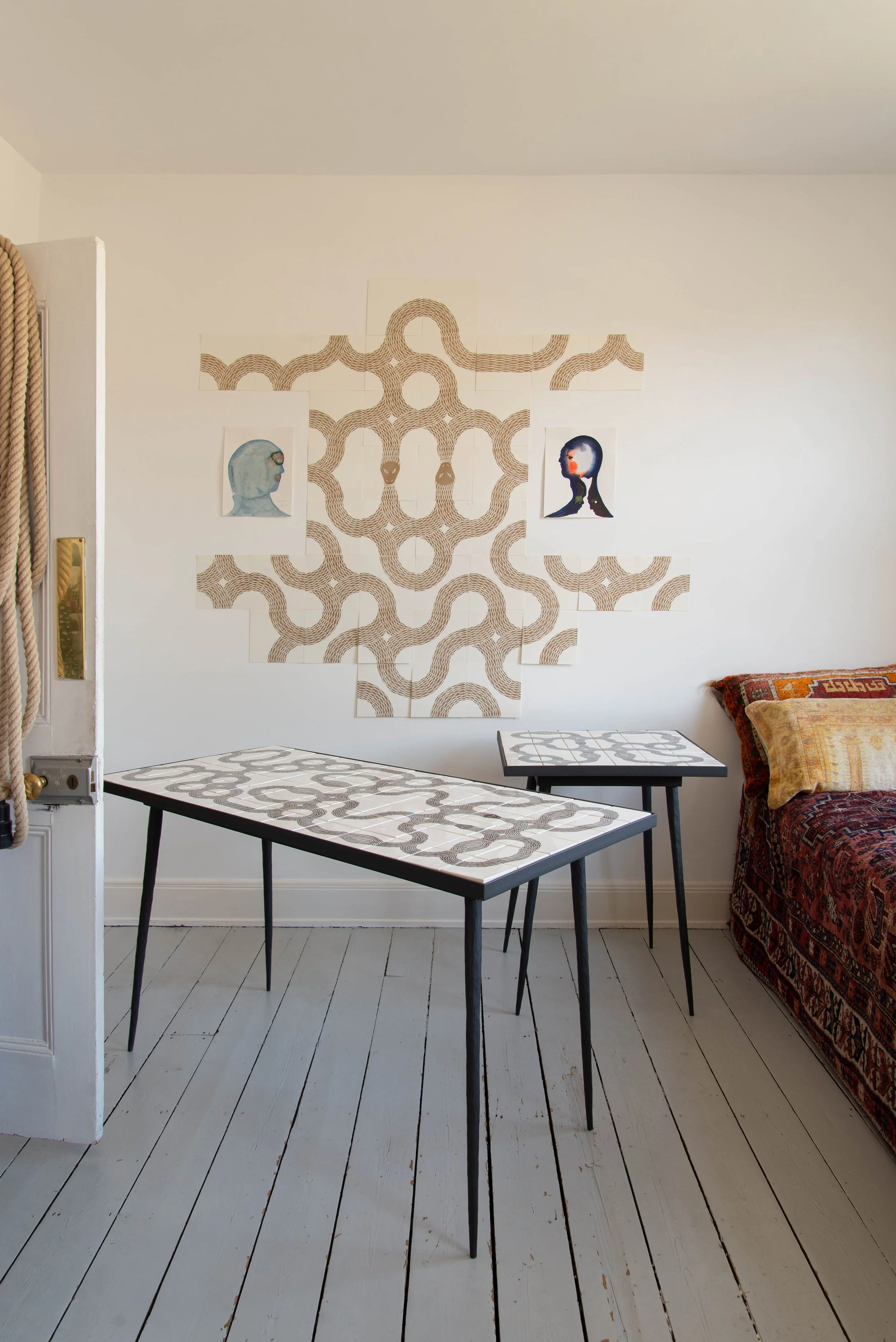 Peter's handcrafted furniture combines elegance and innovation. Infused with his captivating Ouroboros tile designs, each piece resonates with timeless symbolism and meticulous craftsmanship. His furniture pieces are fully bespoke and tell a story of eternal interconnectedness and possibility.