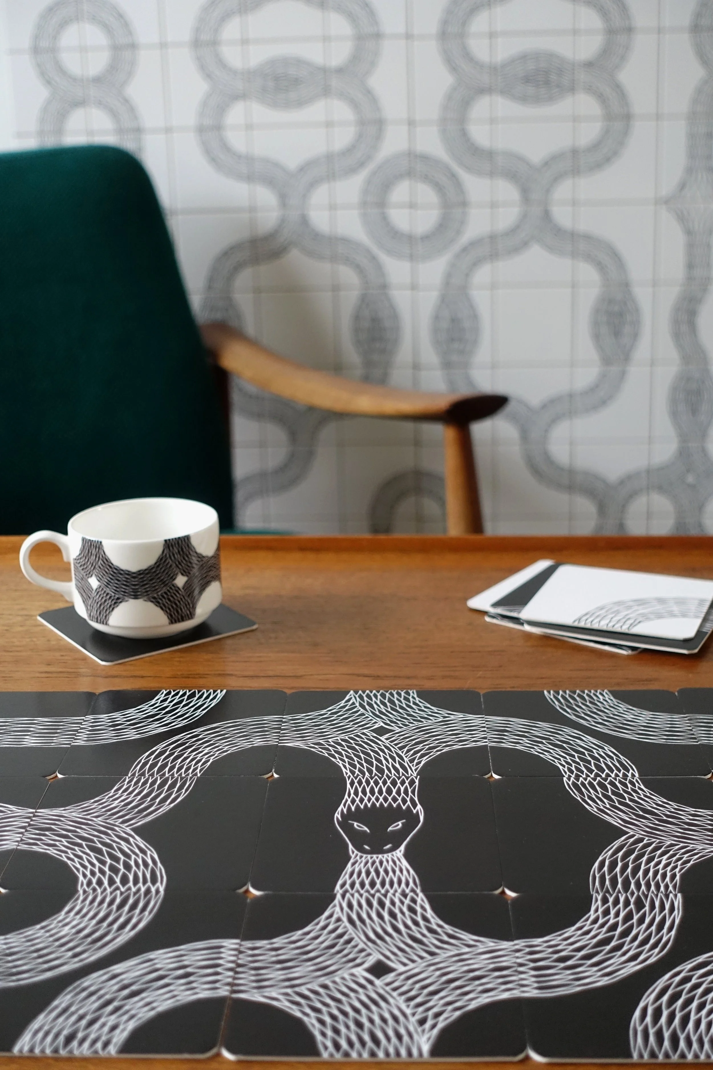 Crafted with passion and expertise in Stoke-on-Trent, renowned as the heart of the English ceramic industry, Peter's Ouroboros tiles bear the mark of tradition and quality. These tiles, inspired by the eternal symbol of the self-devouring serpent, not only adorn domestic spaces but also find their place in the realms of hospitality and commercial interiors.