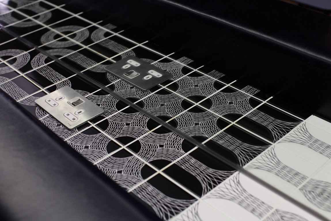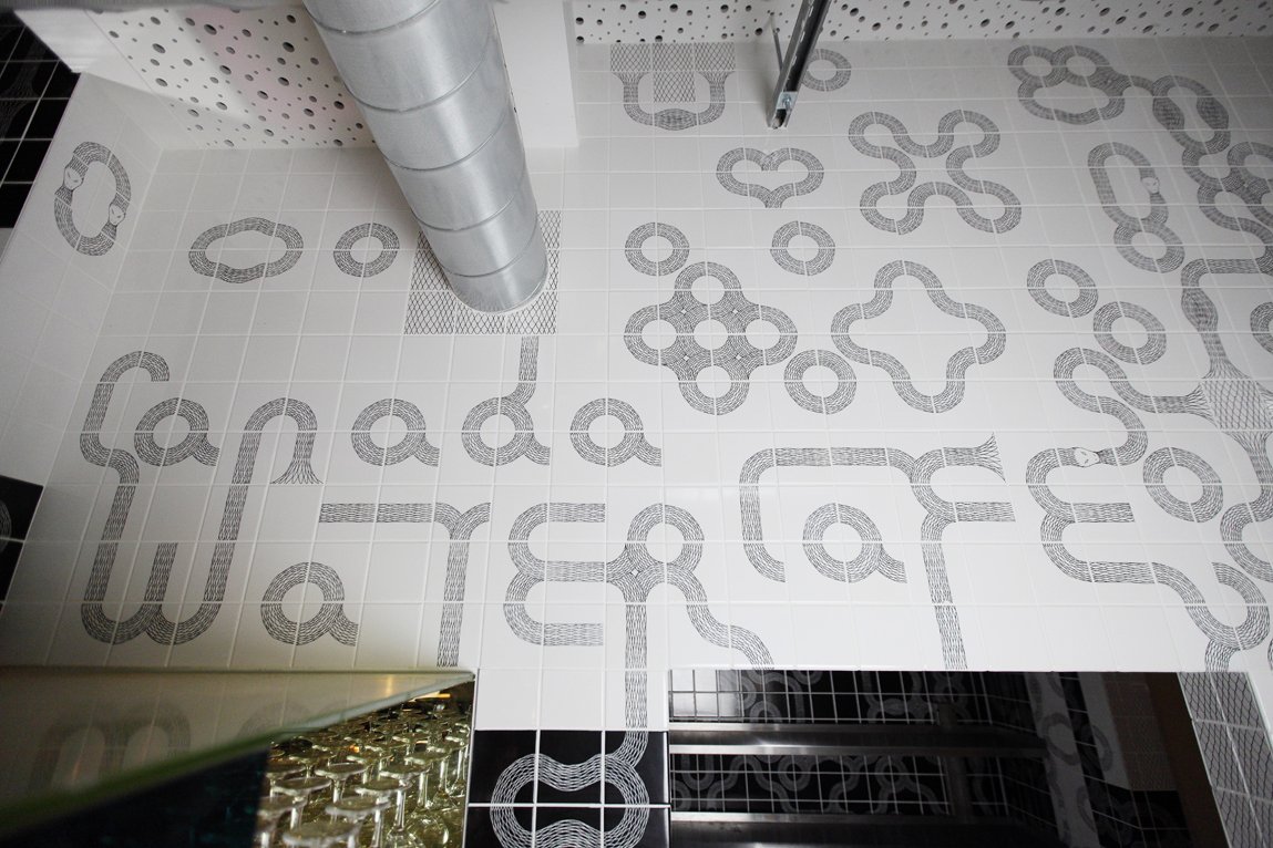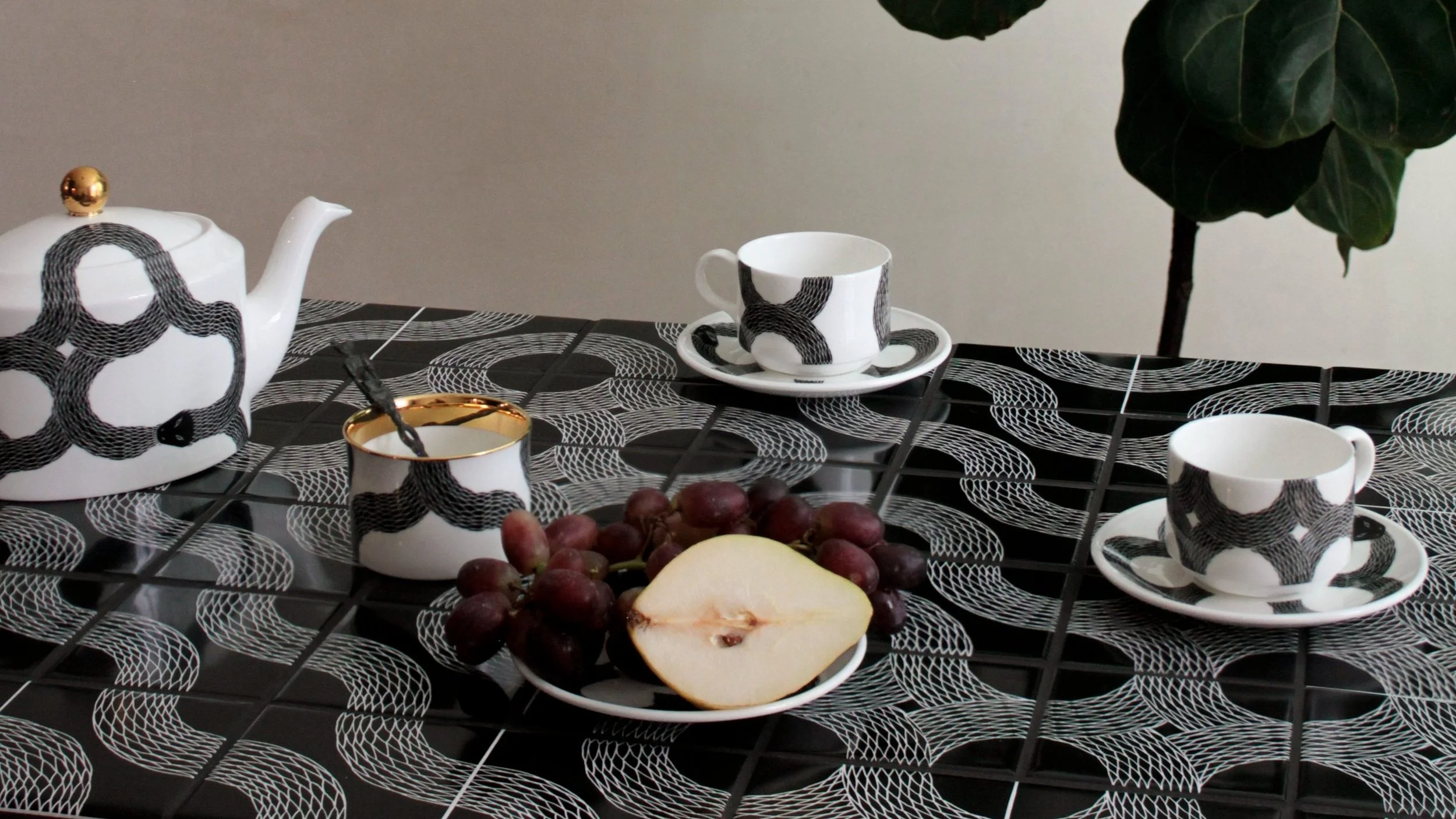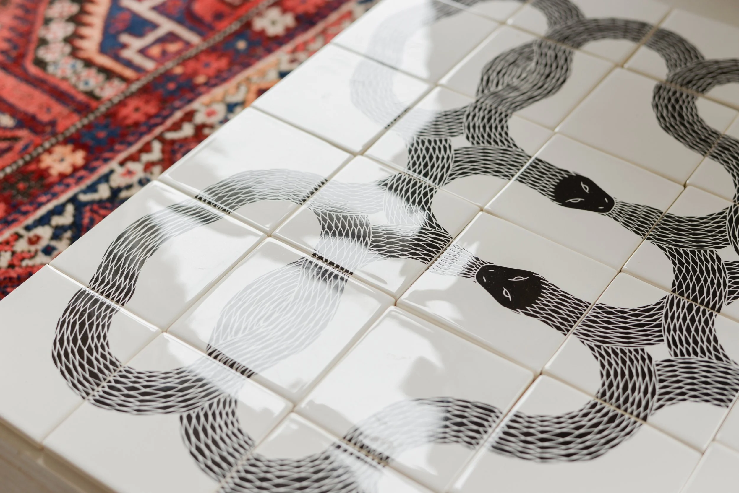 Peter's tiles are based on the Ouroboros, the archetypal symbol of eternity. Their versatile modular design, depicting a self-devouring serpent, allows for endless pattern variations and can bring a dynamic component to any domestic space.