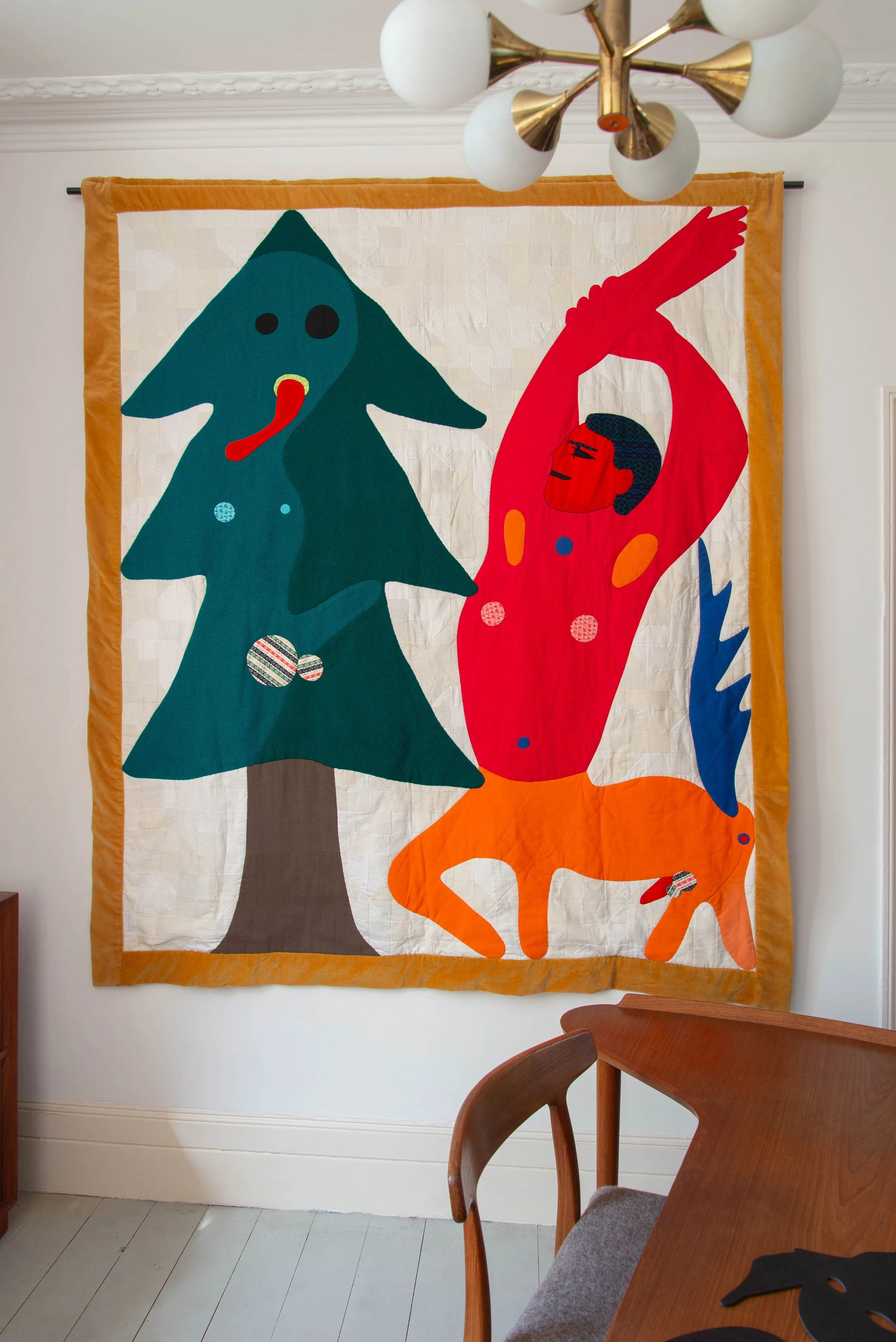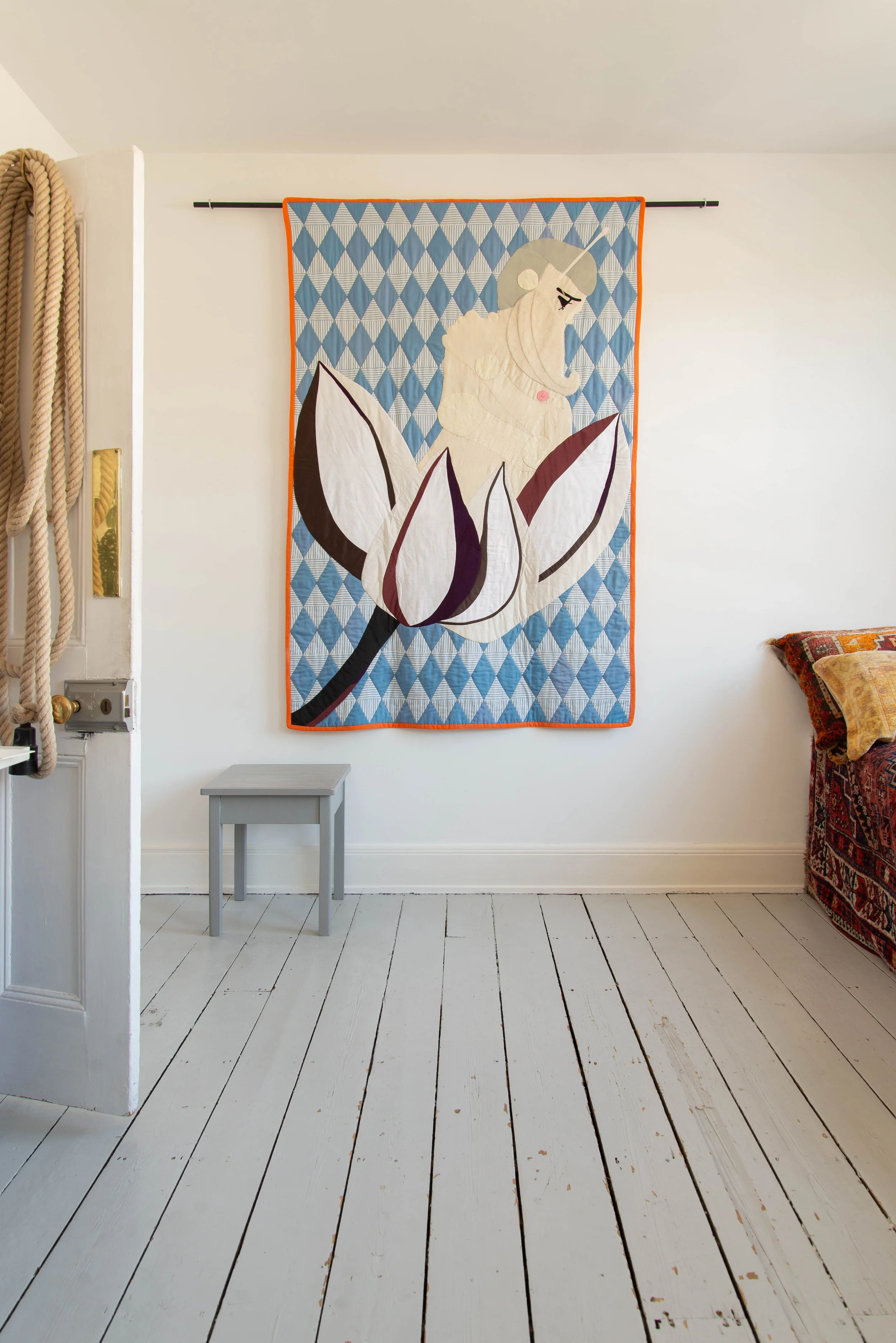 Peter’s meticulously crafted handmade quilts often serve as an extension of the themes found in his watercolours and pencil drawings. Each quilt is a labour of love, intricately pieced together with inherited textiles and materials. Through the medium of quilting, Peter continues his exploration of subconscious realms and conceptual themes, weaving together narratives of identity, spirituality, and sensuality.